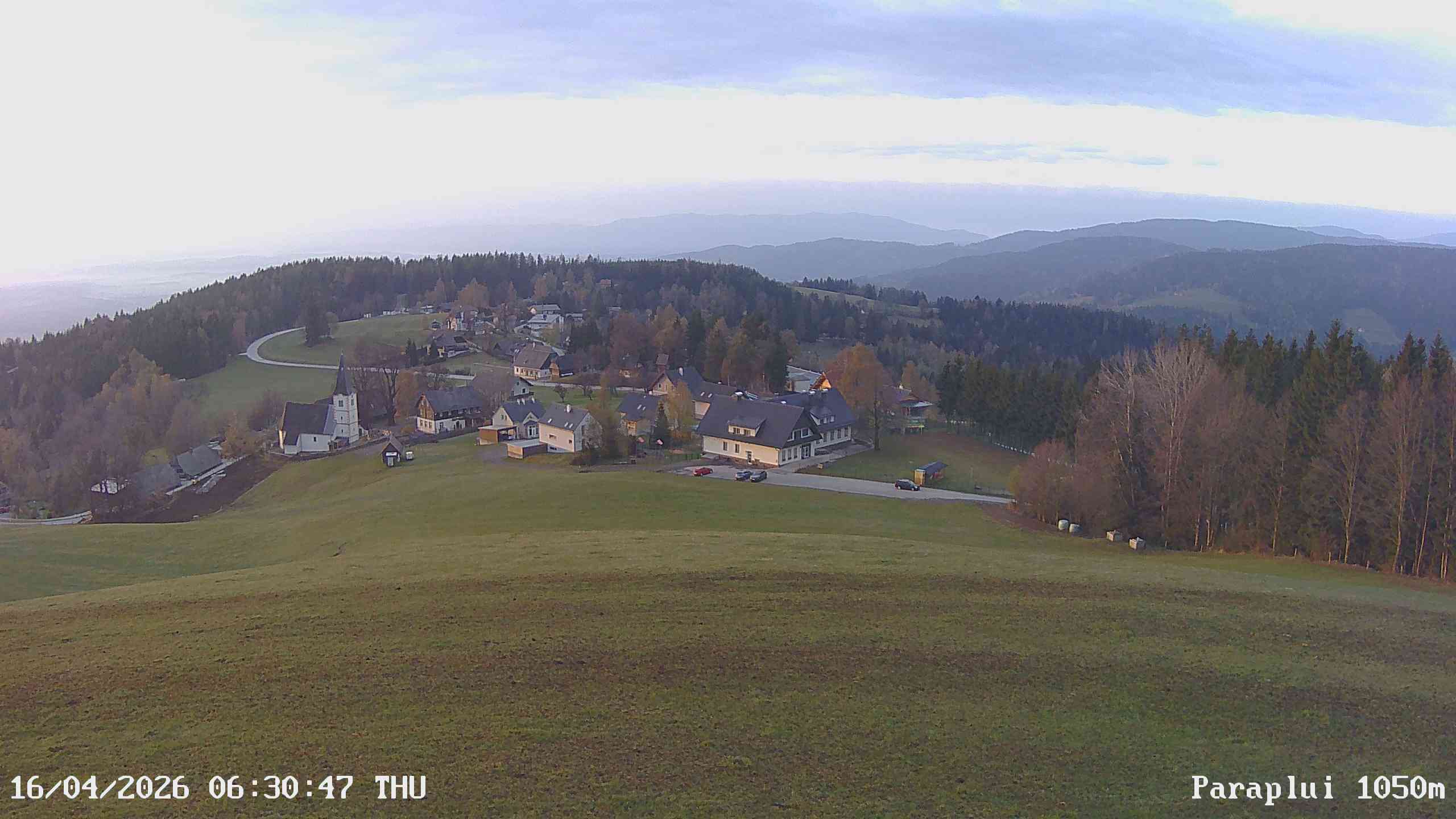Die Webcam in Trahütten befindet sich am nahe dem Ort gelengenen Paraplui auf 1050m Seehöhe und blickt in Richtung Süd-Osten. Am Bild zu sehen ist der Ort Trahütten im Vordergrund und das Possruck Gebirge sowie die Slowenischen Voralpen im Hintergrund.